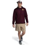* Micron(tm) polyester is a lightweight, wind/water-resistant fabric * Embossed inserts for subtle textured pattern * Micromesh lined nylon body * Taffeta lined sleeves * Woven label * Quarter zip pullover style with zipper garage * Set-in sleeves * Front pockets * Spandex bound cuffs * Side seam zipper for easy on/off * Dropped tail with side vents